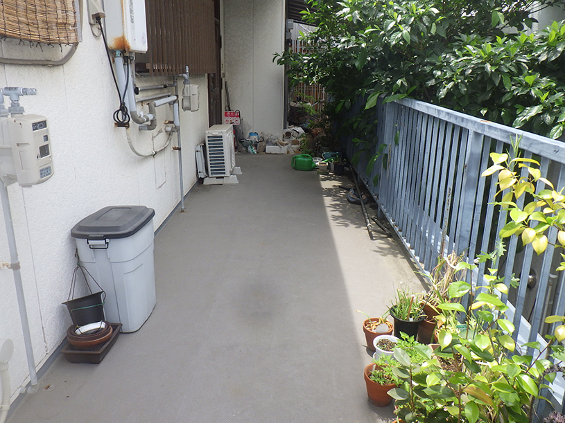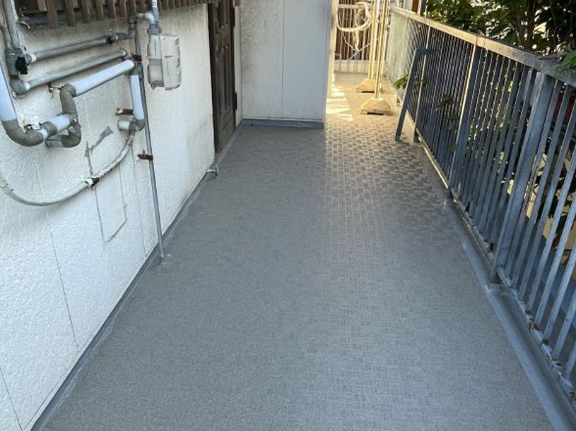 1階テナントの2階建てアパートにて、1階テナント室内に雨漏れの不具合が発生し、2階通路の床シートを張り替えました。