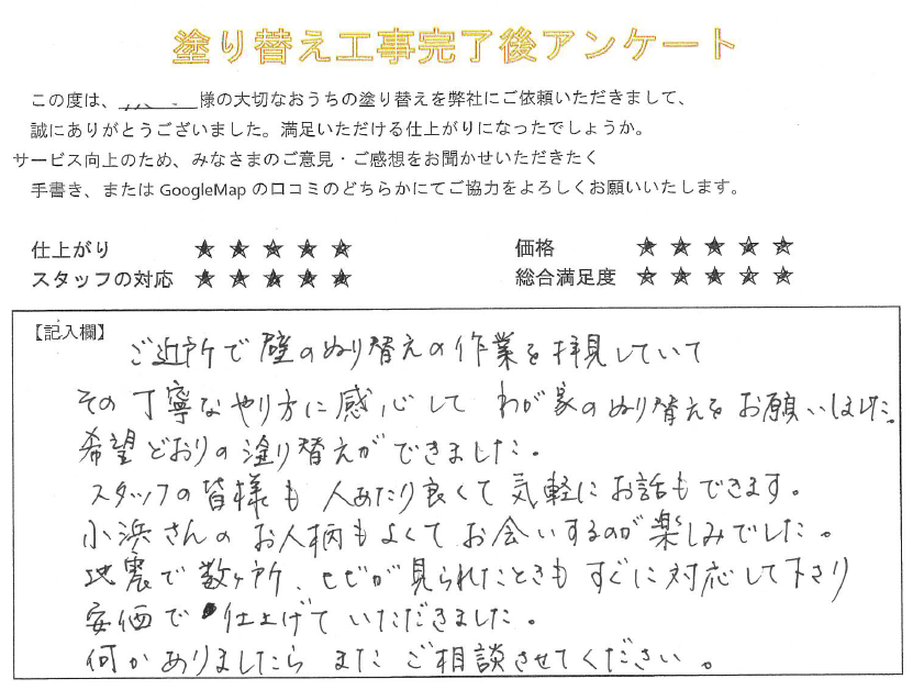 地震で数か所、ヒビが見られたときもすぐに対応して下さり、安価で仕上げていただきました。