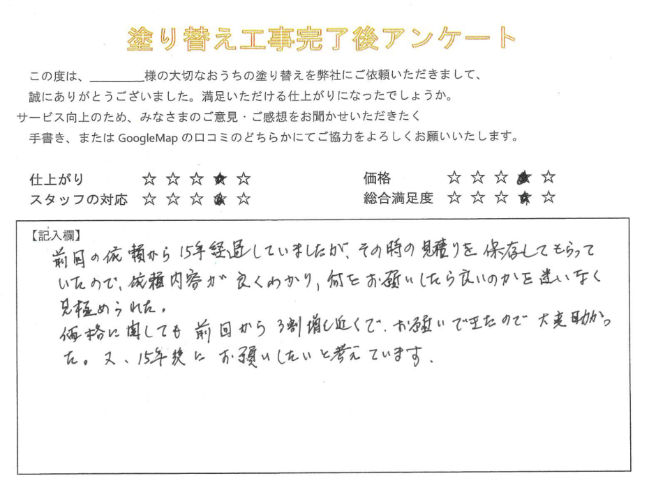 前回の依頼から15年経過していましたが、その時の見積りを保存してもらっていたので、